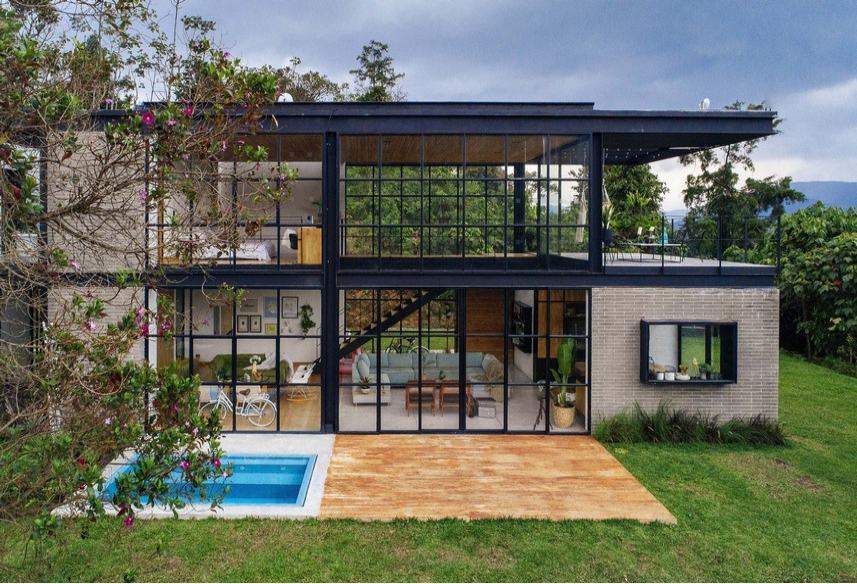 這個釉面金屬結構集成房屋有兩個水平的地板,被真空攔截,房子的空間朝向這個樓層。沒有墻壁,
