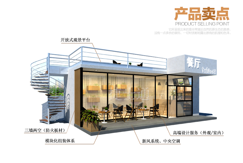 一個創(chuàng)新的商業(yè)空間載體不僅僅是捷士通移動房屋一直進取的方向,同樣也是諸多商業(yè)管理公司一直尋找的全新商業(yè)經(jīng)營模式,美好移動空間締造者捷士通移動房屋,經(jīng)積累的多年行業(yè)經(jīng)驗,通過運用裝配式房屋體系、鋼結(jié)構(gòu)為主體,搭配專利性墻體材料的形式,利用環(huán)保、便捷及美觀的設(shè)計理念,打造20-200平米輕奢移動商業(yè)空間體—售貨屋及整條街售貨屋、售賣屋系列。咨詢熱線:158 2288 2616