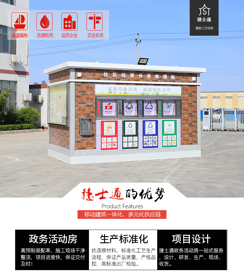 捷士通生產的主要是環(huán)保分類垃圾房和大型垃圾房。大型垃圾房廠家,擁有多條垃圾房產品線,垃圾房內部配備各種技能技術和*技術,在垃圾房領域占有制高點。
