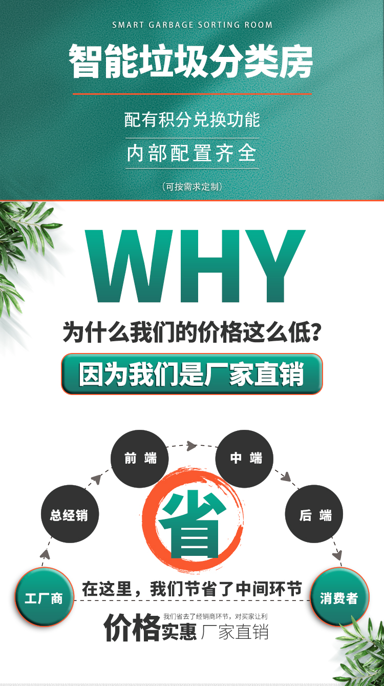 垃圾分類房系列產品外觀整潔大氣,高端時尚,可融入周邊建筑群體,并可為垃圾分類引導員提供休息執(zhí)勤的空間,房屋內部設備配套齊全,可有效解決氣味污染、環(huán)境視覺污染等問題。垃圾分類房的設置可以減少垃圾處理量和處理設備,降低處理成本,減少土地資源的消耗,具有社會、經濟、生態(tài)等幾方面的效益,在垃圾分類工作中發(fā)揮了不可替代的作用。我公司致力于垃圾分類房的整體解決研發(fā)設計,擁有強大的研發(fā)團隊、設計團隊、銷售管理團隊以及自動化流水線式的生產車間,致力于開拓全國、服務全國,打造全國先進的垃圾分類房生產廠家。