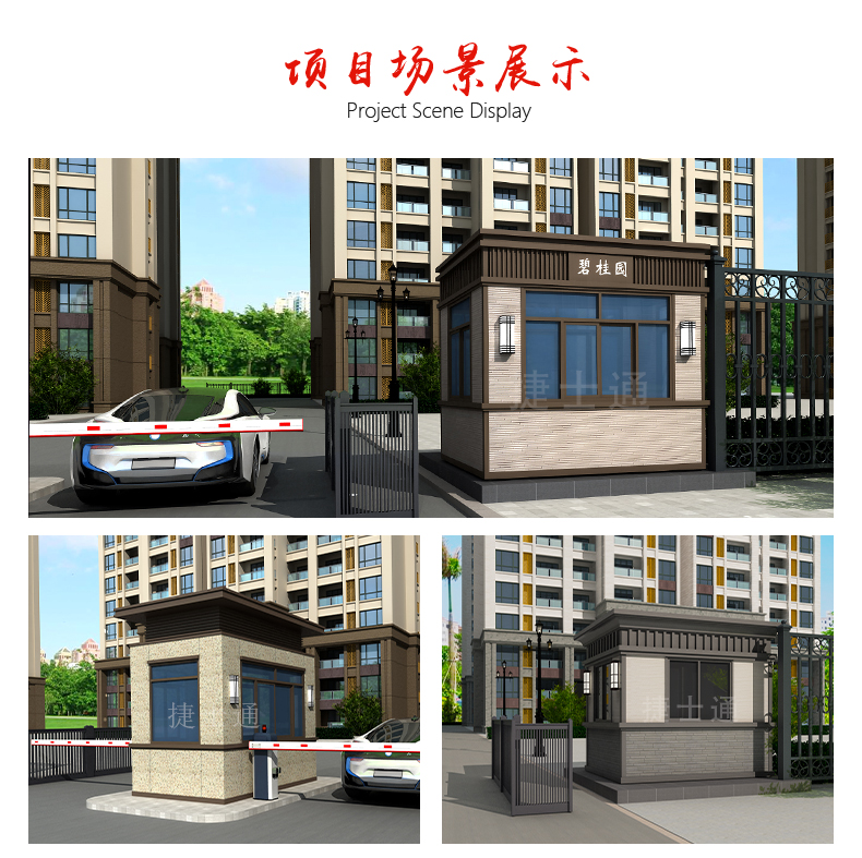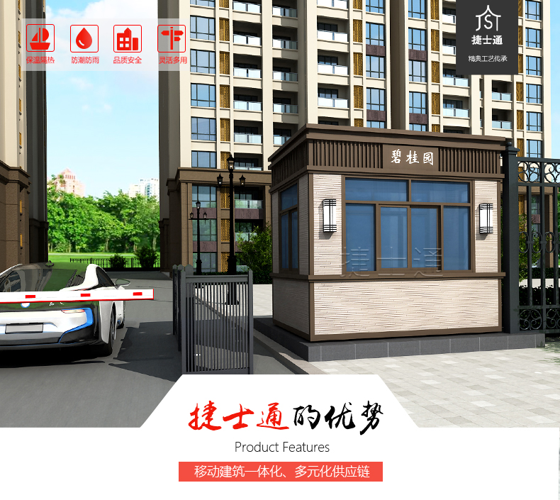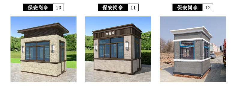 框架為全鋼骨架,外墻板為先進的建筑外墻板,具體完好的保溫隔熱性能,是以往外墻板材料無法比擬的,正常使用年限10-20年之久,可謂是保安崗亭中的上品。
