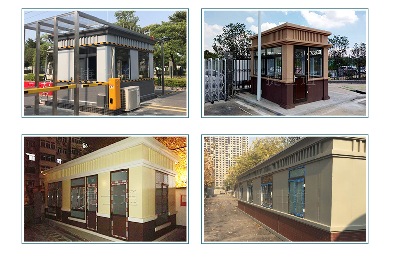高端保安崗亭外墻使用提供多種現代化高端材墻板的選擇:其墻板可防褪色、防火、耐污性好、水性環(huán)保、使用壽命長、外墻硬度高